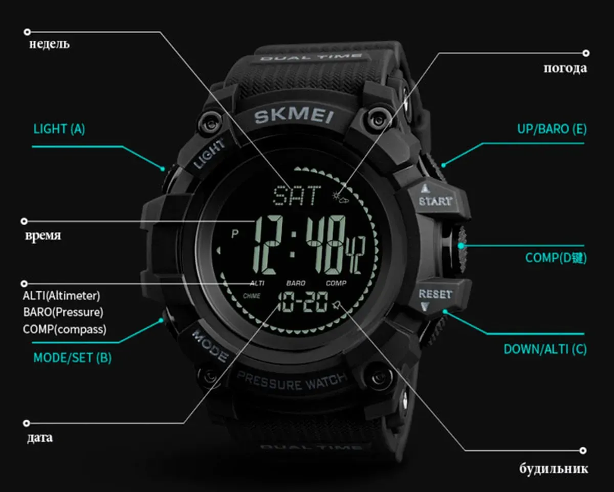 альтиметра, шагомера, підсвічування і багатьох інших. Годинник має підвищену