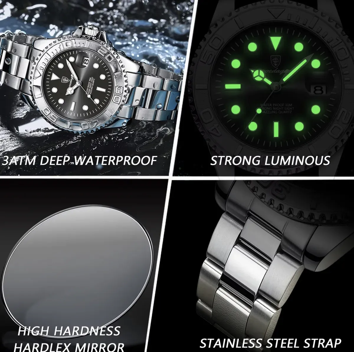 Якісні матеріали: нержавіюча сталь, міцне мінеральне скло, надійні кварцові механізми.