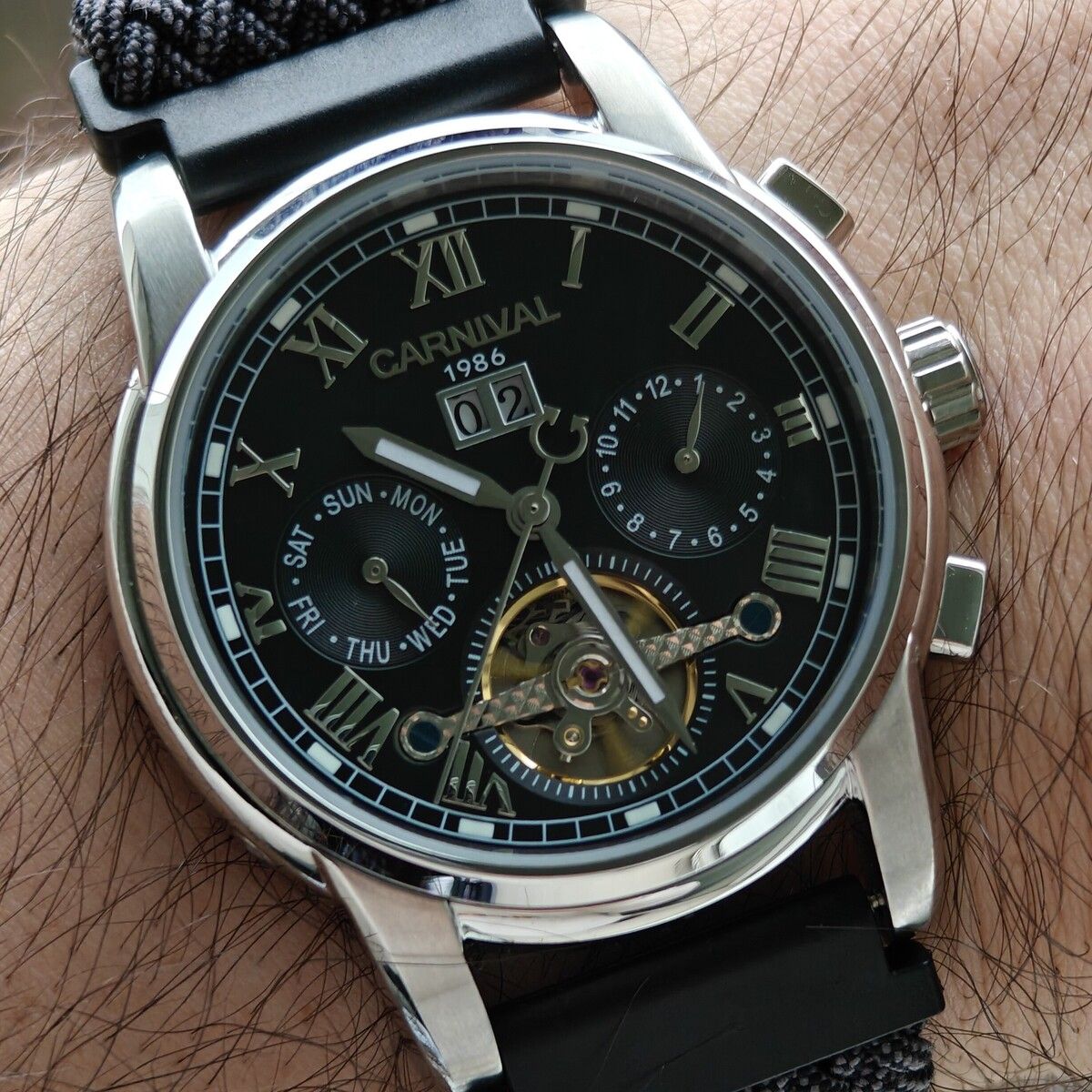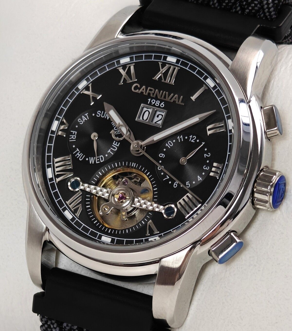 Функції:Маятник "Турбілліон Х", показують дату, місяць, день тижня