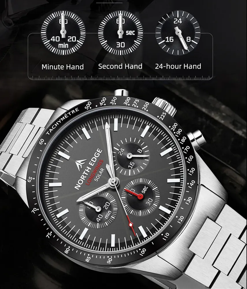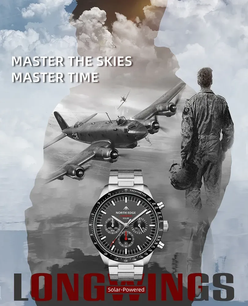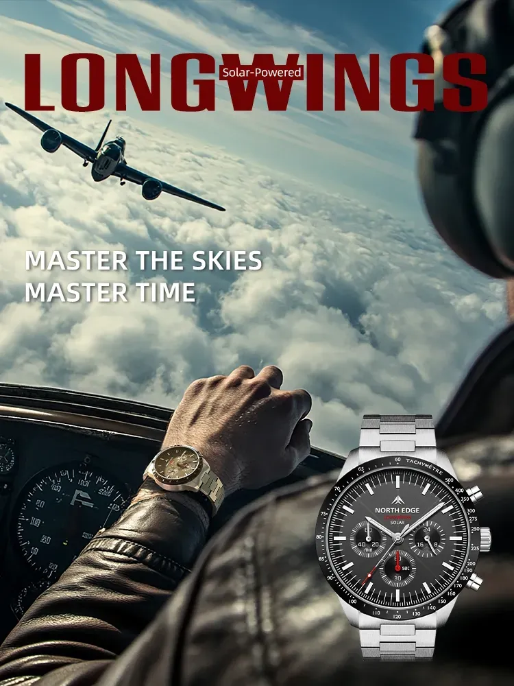 North Edge Long Wings - це найновіша розробка бренду North Edge призначена для пілотів. Модель виконана зі сталі 316 проби, має закаляне протиударне скло та оснащена сонячною батареєю в додаток до основного японського механізму. Завдяки новітній системі Solar Power годинник може працювати автономно від енергії сонця навіть з основною батарейкою, яка сіла довгий час. Разом з неперевершеним дизайном ця модель ідеально підійде для важких умов і поціновувачів якісних речей.