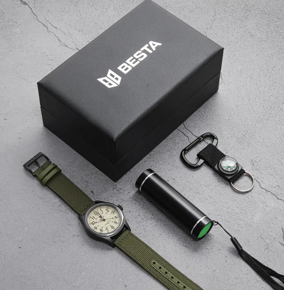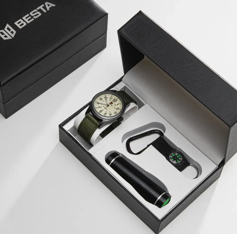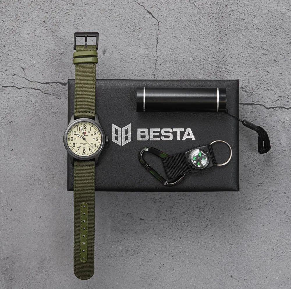 Besta Box Command Light - унікальний подарунковий набір для себе або найближчих. Набір складається із тактичного годинника, ліхтарика, застібки з компасом та елегантної фірмової подарункової коробочки.