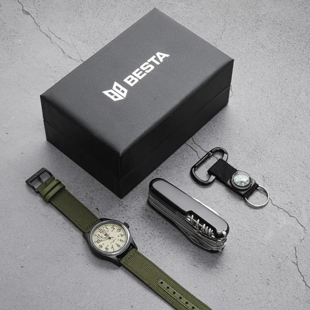 Besta Box Command Set - унікальний подарунковий набір для себе або найближчих. Набір складається із тактичного годинника, ножа, застібки з компасом та елегантної фірмової подарункової коробочки.