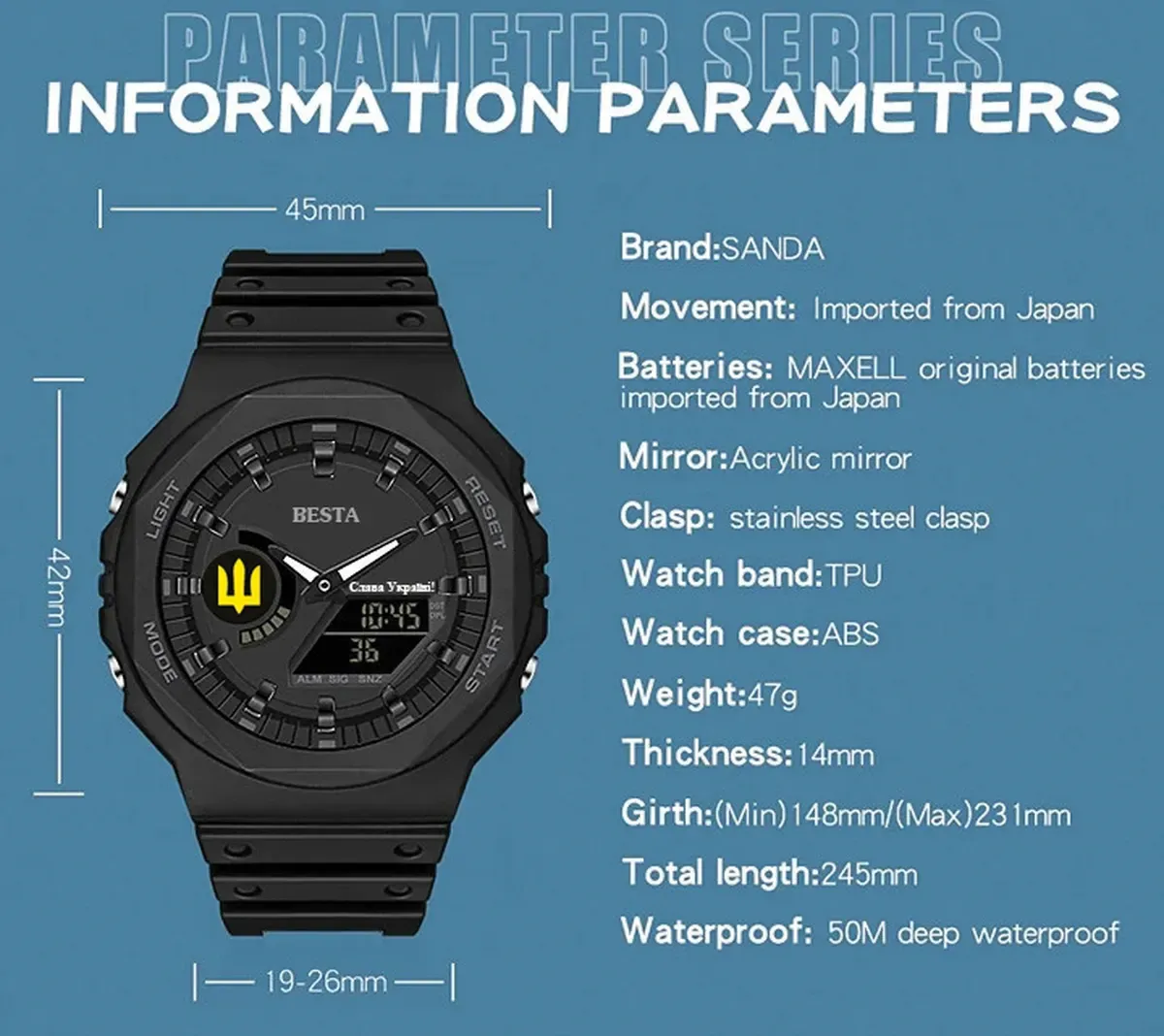 Функції:Секундомір, будильник, підсвічування, час показується на циферблаті й стрілками, дата, день тижня, місяць