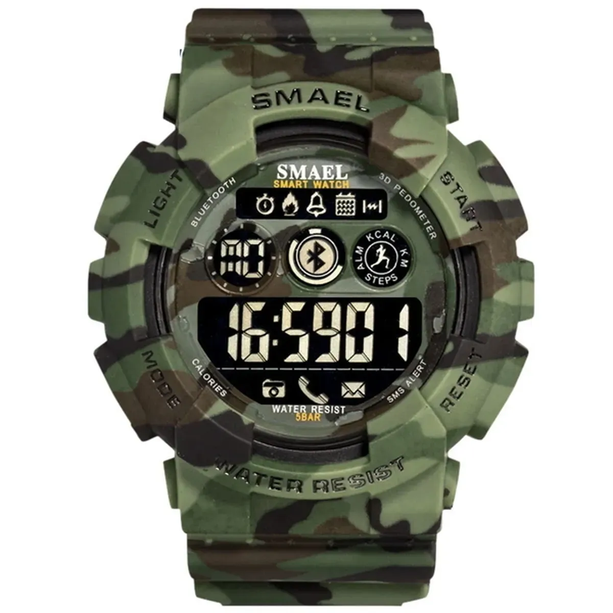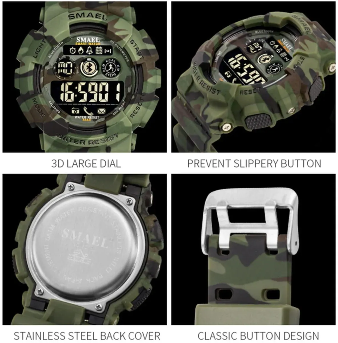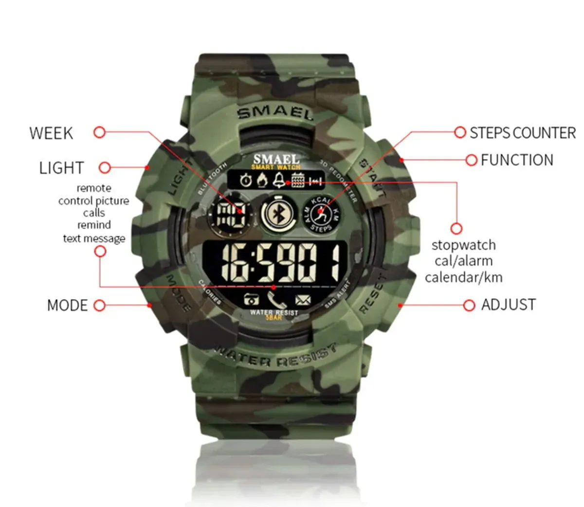 Smael - бренд якісних, спортивних, тактичних годинників. Годинники мають стильний дизайн, надійний механізм, не бояться води і при цьому мають демократичну ціну і офіційну гарантію. Великою перевагою даної моделі є можливість поєднання з телефоном, оповіщення про дзвінки, крокомір та фітнес-трекер.