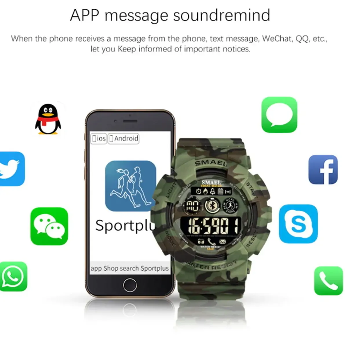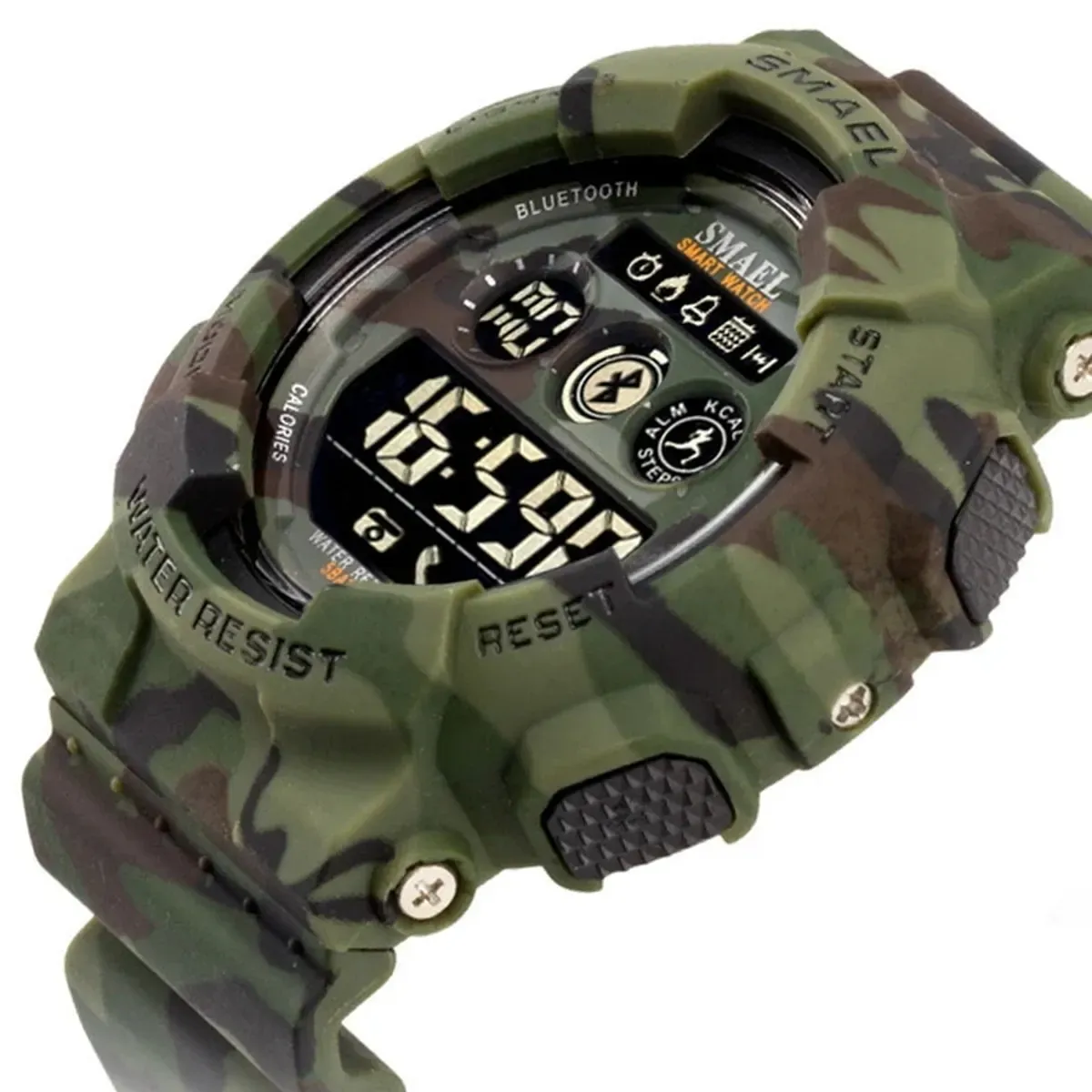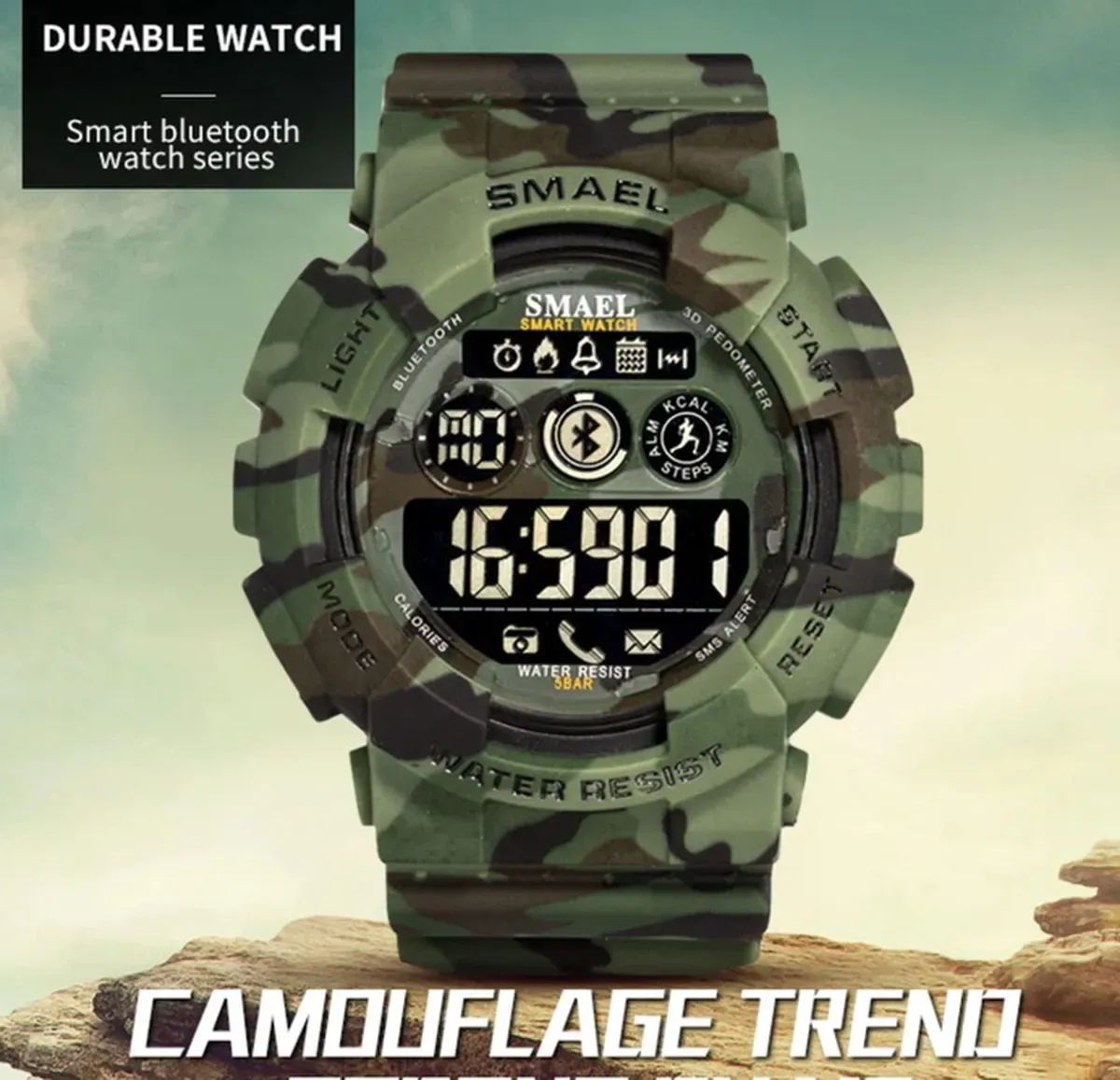 Smael - бренд якісних, спортивних, тактичних годинників. Годинники мають стильний дизайн, надійний механізм, не бояться води і при цьому мають демократичну ціну і офіційну гарантію. Великою перевагою даної моделі є можливість поєднання з телефоном, оповіщення про дзвінки, крокомір та фітнес-трекер.