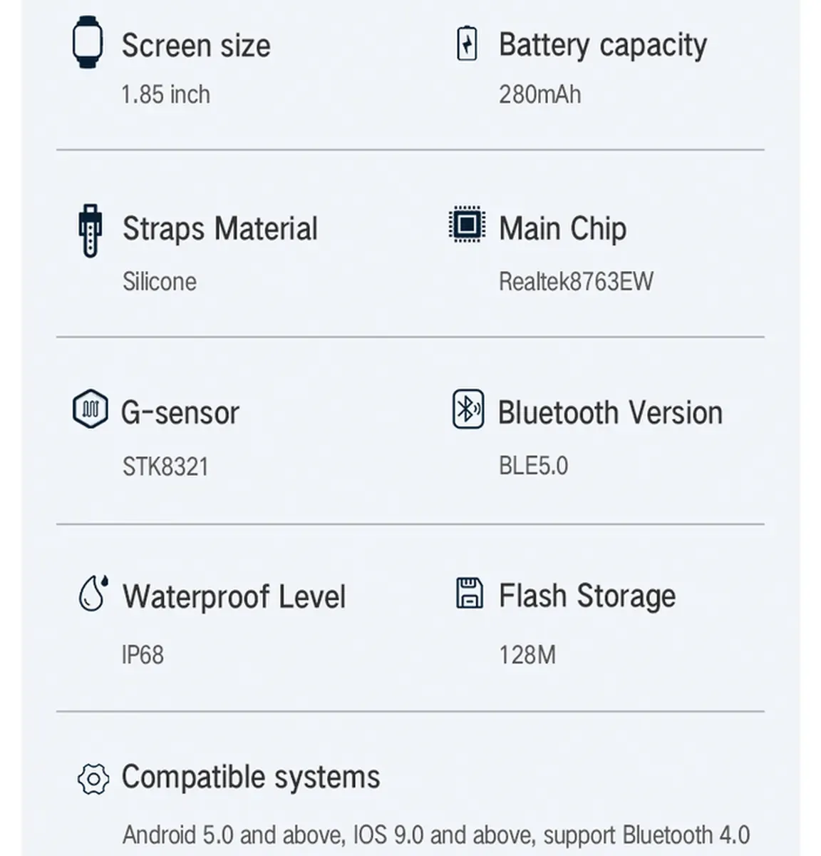 Особливості:Вимірювання пульсу. кисню у крові. оповіщення про всі події на телефоні. управління музичним плеєром. режим бігу і спортивних ігор. розширений фітнес - трекер. функція "Розумний сон +". вело-трекер. режим нагадувань. дистанційне керування камерою. будильник. годинник. педометр. секундомір. більше 20 видів спорту і тренувань. зміна заставок екрану. функція Антілост. підрахунок калорій.