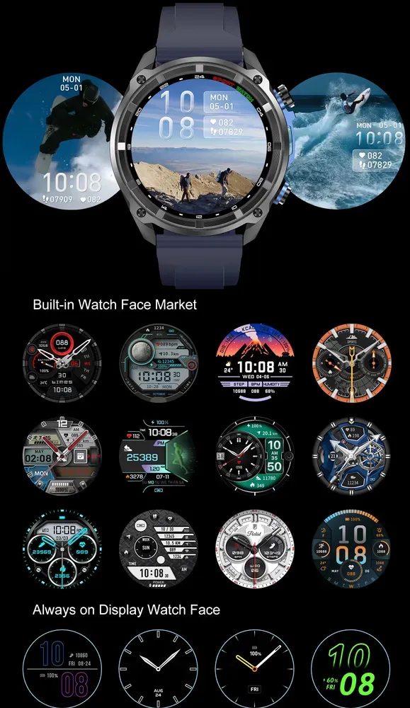 Особливості:Вимірювання пульсу/кисню в крові; Лічильник калорій, Крокомір, Відстань, Швидкість; 100+ режимів спортивних режимів та тренувань; GPS відстеження маршруту і координат; Функція "Розумний сон+"; Компас, Альтиметр, Барометр; Ліхтарик; Bluetooth дзвінки; Безліч циферблатів на вибір; Керування програвачем телефону; Новий Amoled дисплей.