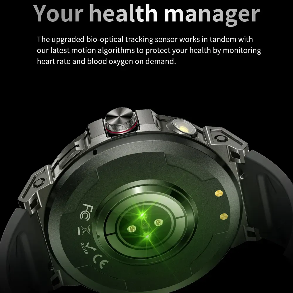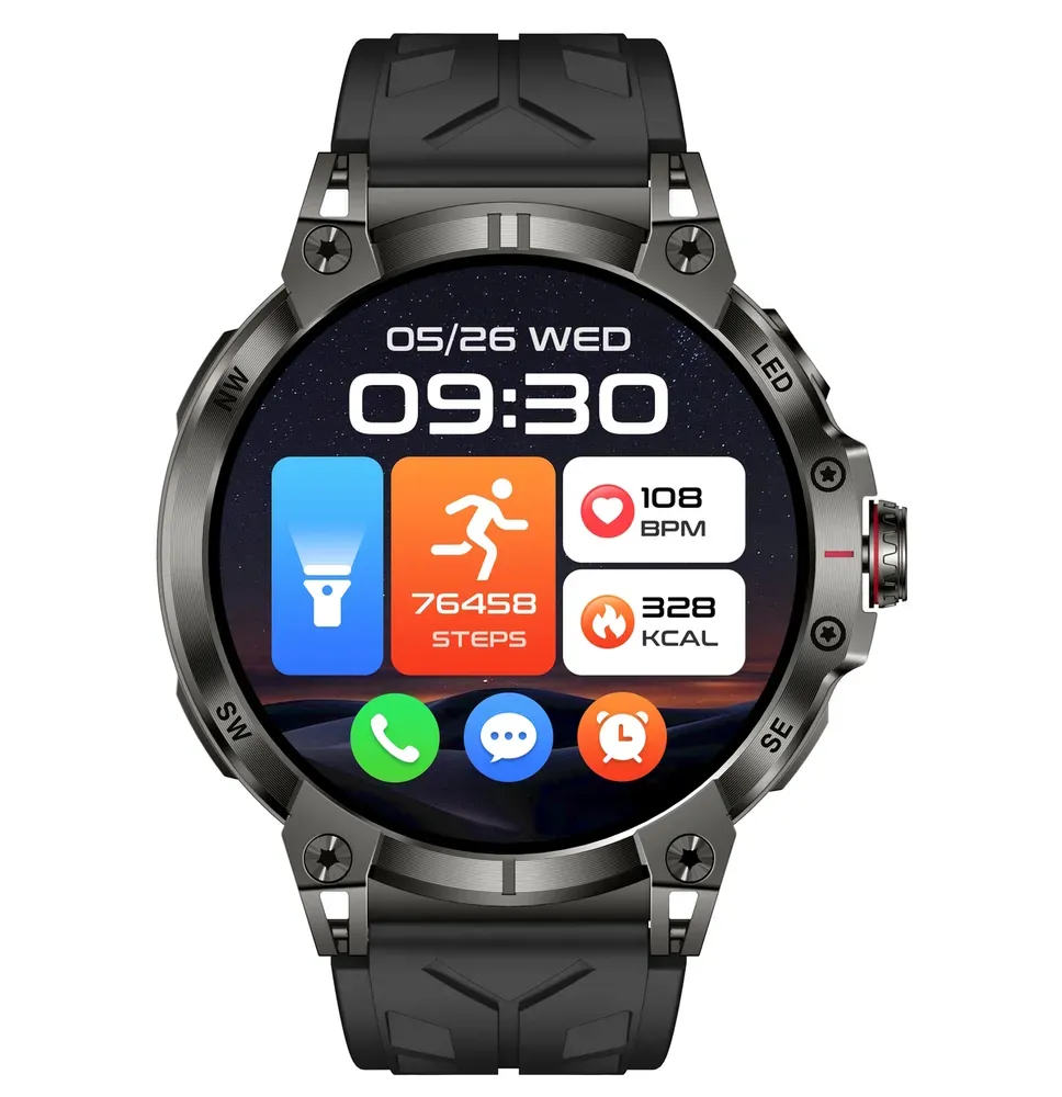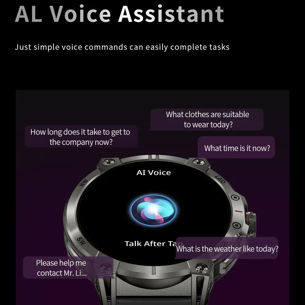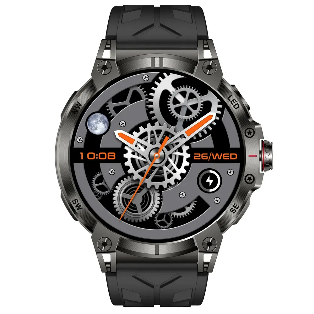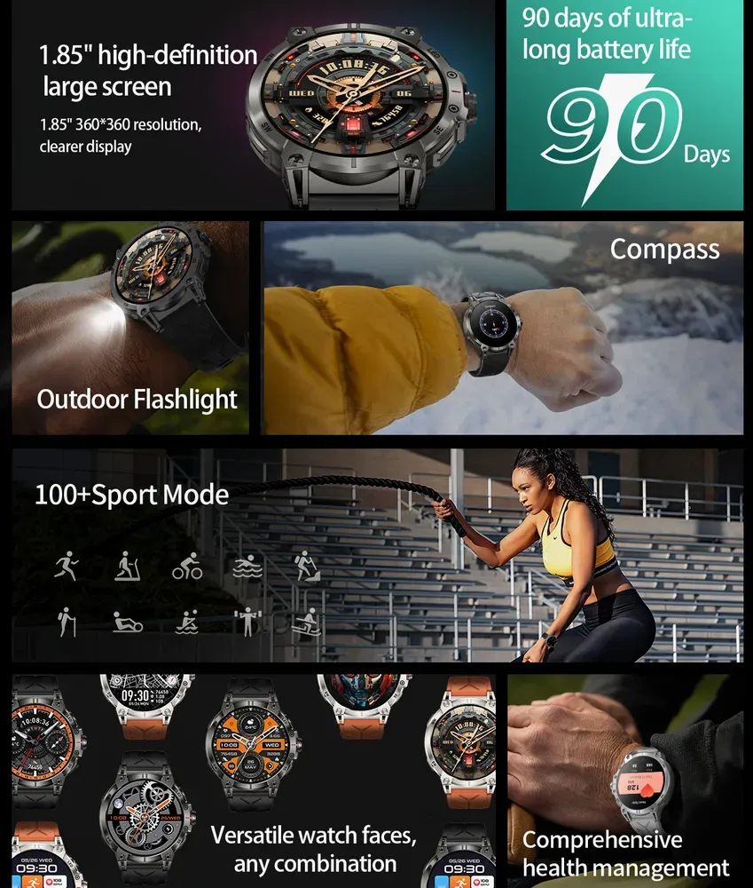 Особливості:Компас; Будильник; Секундомір; Вимірювання пульсу/тиску/кисню в крові; Режим бігу, тренажерного залу та спортивних ігор (100+ спортивних режимів); Функція "Розумний сон+"; Відображення погоди; AI помічник; Дистанційне керування камерою; Керування програвачем телефону; Ліхтарик; Потужна батарея; Безліч циферблатів на вибір; Ударостійкий корпус; Калорії, тривалість вправ, темп, відстань.