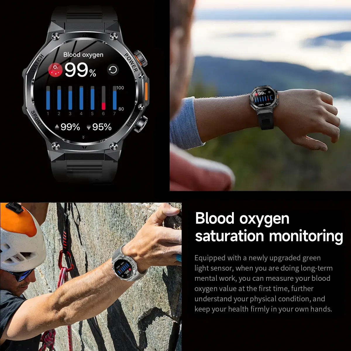 Особливості:Вимірювання пульсу/кисню в крові; 100+ спортивних режимів та тренувань; Функція "Розумний сон+"; Режим нагадувань; Компас; Будильник, Секундомір, Ліхтарик; Дистанційне керування камерою; Керування програвачем телефону; Понад 100 дисплеїв на вибір; Синхронізація з мобільним пристроєм на Android або iOS за допомогою з'єднання Bluetooth; Відображення погоди