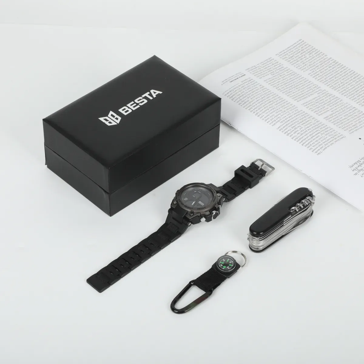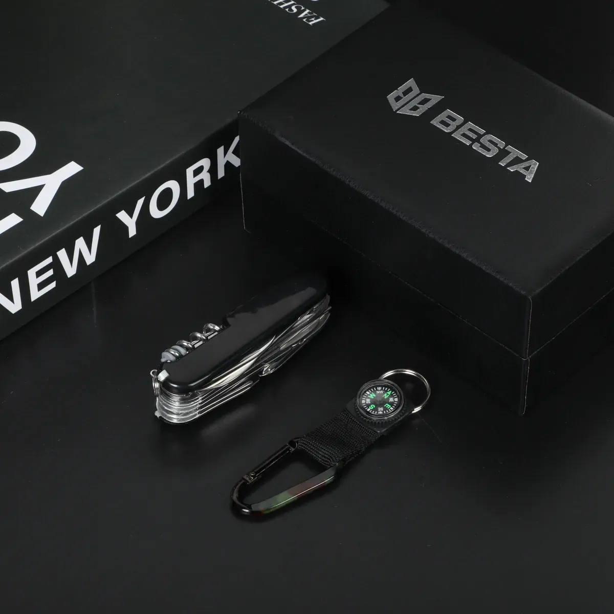 Подарунковий набір складається з елегантної коробочка зі шкіри з написом BESTA "Слава Україні!", тактичної застібки з компасом і тактичного ножика. В набір можна додати будь-який годинник з сайту. Виглядає елегантно і дорого, ідеально доповнить годинник на подарунок.
